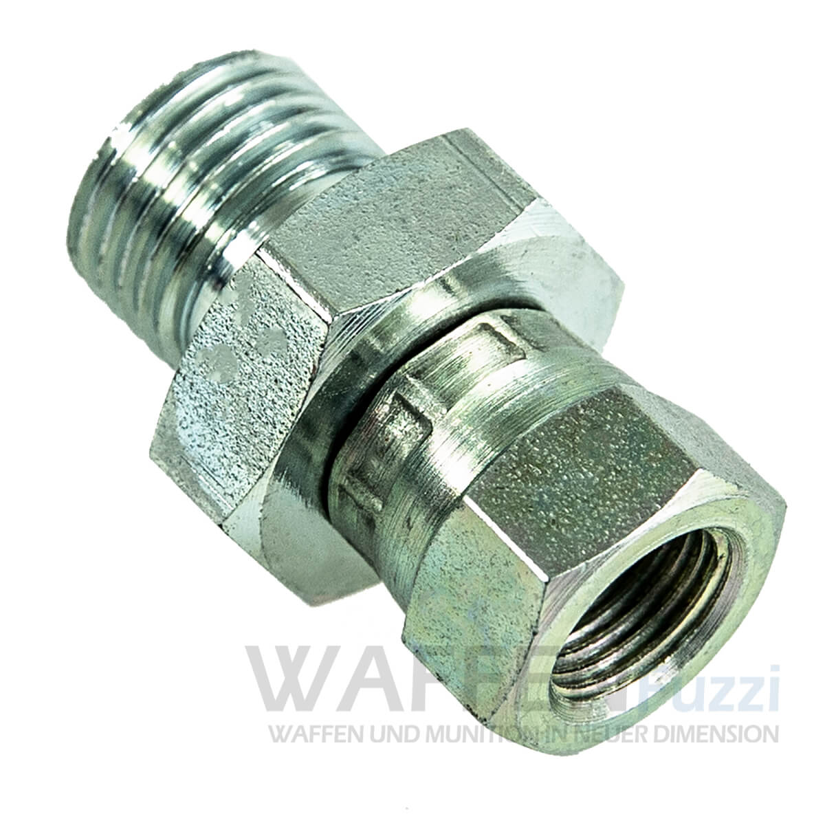 Pressluft Zubehör für Pressluftwaffen und deren Befüllungsgeräte. Der Verbindungsstecker hat an einem Ende ein weibliches 1/8" BSP Gewinde, am anderen Ende befindet sich ein männliches 1/4" BSP Gewinde und verbindet auf einfache Art und Weise zum Beispiel 2 Pressluftschläuche miteinander.