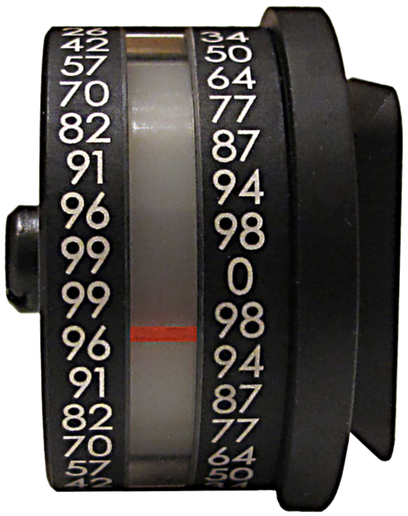 - Die orangefarbene Nadel zeigt den Prozentsatz der Neigung des Gewehrs an, um die Schussentfernung für die Schwerkraft leicht zu berechnen.