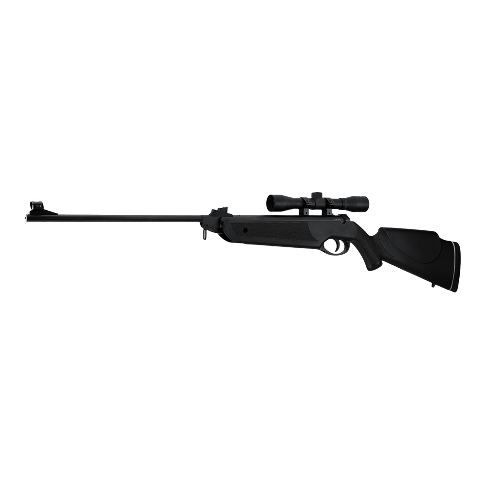 Das kleine handliche und unverwüstliche, sowie klassische Freizeit Luftgewehr Hämmerli Black Force 400 mit Knicklaufsystem zeigt sich zusammen mit dem Zielfernroh mit 4-facher Vergrößerung als besonders beliebt speziell bei der Jugend. Nichts desto trotz zeigt das Hämmerli 400 Combo beachtliche Leistung und konstante Flugbahnen bis 20 Meter. Der robuste Polymerschaft lässt sich auch von schlechtem Wetter nicht beeindrucken und sitzt durch die gummierte Schaftkappe sicher in der Schulterbeuge. Das Fiberoptik-Korn erleichtert das Anvisieren des Ziels. Die Kimme ist in der Höhe- und Seitenrichtung justierbar und erlaubt eine schnelle Zielerfassung. Technisch gesehen rundet eine automatische Sicherung und die Riemenbügel die gute Ausstattung des Freizeit Luftgewehrs ab.