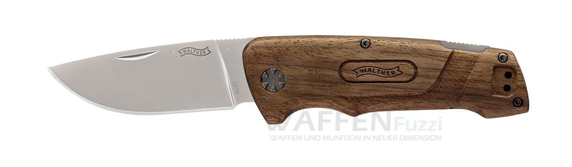 BWK 4 Taschenmesser Blue Wood Knife 440C Stahl inkl. Lederholster Aus der Outdoor-Familie der Walther Blue Wood Knives (BWK) kommt hier nun das Tanto Blue Wood Knife Modell 4, frisch aus der IWA 2019. Das Messer mit der Tanto-Klinge zwischen zwei Griffschalen aus Walnussholz ist der perfekte Begleiter für das Natur-Erlebnis. Die Klinge besteht aus 440 C Stahl mit grau titanisierter Oberfläche für noch mehr Langlebigkeit. Auf dem Rücken der 94 Millimeter langen Klinge befinden sich der Nagelhau und die Daumenauflage. Die Linerlock-Verriegelung arretiert zuverlässig und über die schwarze Universal-Achsschraube regelst du die Dynamik des Klappens mit nahezu jedem Gegenstand. Mit seiner Struktur und präzisen Fingeraussparungen behältst du das Walther BWK 4 bei jeder Witterung fest im Griff. Der gebläute Liner verbindet die Klinge mit den Griffschalen. Wichtiges in der Übersicht: Klingenmaterial 440C-Stahl Klingenlänge 94 mm Gesamtlänge 225 mm Gewicht 172 g Griffmaterial Holz Arretierung Linerlock Öffnungshilfe Nagelhau Artikel ist frei ab 18 Jahre! Bestimmte Messer dürfen nicht überall geführt werden. Informieren Sie sich bitte im Vorfeld über die Gesetzeslage "Führen von Messern §42a"