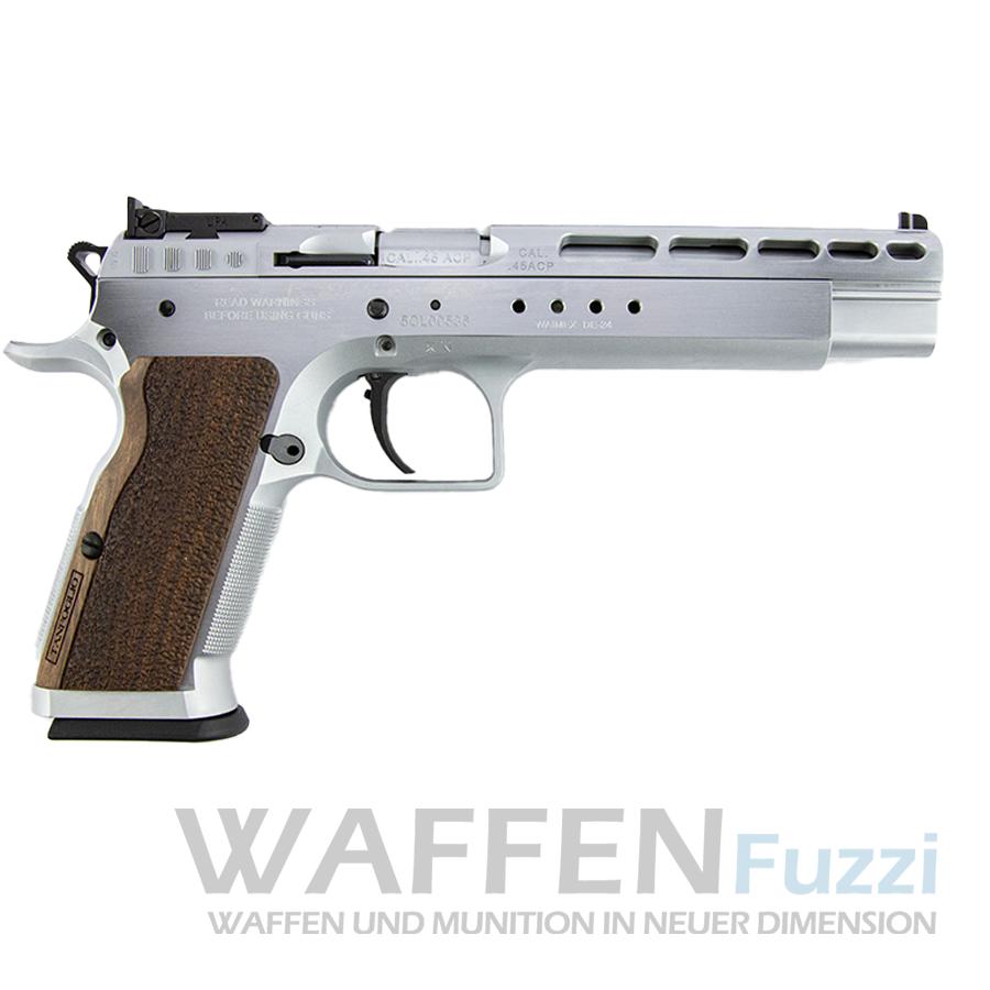 Die Tanfoglio T97L Gold Match Xtreme .45ACP ist eine hochpräzise Wettkampfpistole, die speziell für statische Schießdisziplinen entwickelt wurde. Sie verfügt über einen 6-Zoll-Polygonlauf, der für maximale Präzision sorgt. Das robuste „dark gray“ Finish schützt die Waffe vor chemischen und physikalischen Einflüssen.Der reine Single-Action-Abzug ermöglicht eine schnelle und präzise Schussauslösung, während die ergonomischen Alugriffschalen mit Fischhaut für eine optimale Handlage sorgen. Die beidseitige Sicherung macht die Pistole auch für Linkshänder geeignet.Das verstellbare Visier mit Fiber-Optic-Korn verbessert die Zielerfassung erheblich. Die Pistole hat eine Magazinkapazität von 10 Schuss (.45ACP) und wird mit drei Ersatzmagazinen geliefert. Zusätzliche Features wie ein extra langes Beavertail, ein breiter Abzugsbügel, ein kleiner Jetfunnel (Magazintrichter) und ein Putzset runden das Gesamtpaket ab.Diese Pistole ist nicht nur robust und zuverlässig, sondern bietet auch eine hervorragende Ergonomie und Handhabung, die von Top-Schützen geschätzt wird.Hihglights6 Zoll Polygon Laufhochrobustes darkgray FinishOptional mit WechselsystemBreite Sicherung mit DaumenauflageGroßer Magazinrelease ButtonExtrem guter Abzug mit einstellbarem Triggerstopverstellbare VisierungExtralange BeavertailTechnische DatenHersteller: TanfoglioModell: Gold Match Xtreme 6"Material Griffstück: StahlKaliber: .45ACPSchusskapazität: 10 SchussLauflänge: 152 mmGesamtlänge: 255 mmGewicht: 1.360 g (mit leerem Magazin)Abzug: SASicherung: beidseitig BedienbarVisierung: LPA Höhe und SeitenverstellungIm LieferumfangTanfoglio Gold Match4x Magazin 10-Schuss1x SaftyflagReinigungszubehör (Öl und Bürste)2x Extra Federn extra Werkzeug ZubehörBeschreibungstabiler XXL Waffenkoffer mit SchlossvorrichtungLadehilfeFür den Erwerb dieser Waffe muss ein Erwerbsnachweis in Form einer WBK, Jagdschein oder einer Handelslizens vorliegen!