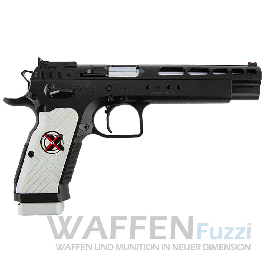 Die ultimativen Wettkampfwaffen auf dem Waffenmarkt sind nicht umsonst aus dem Hause Tanfogio made in italy. Waffenfuzzi ist stets daran interessiert, sein Warensortiment an die heutigen Bedürfnisse eines jeden Sportschützen anzupassen. Der 6 Zoll Polygonlauf setzt auf höchste Schussqualität. Die extra lange Beavertail bietet einen optimalen Halt und ermöglicht durch die hohe Griffigkeit einen ruhigen und konzentrieten Schuss. Extra breite Sicherung, Fischhaut an der Griffvorder- und Rückseite. Der kleine Jetfunnel auch Magazintrichter genannt ermöglicht ein schnelles Einführen des Magazins. Die extrem belastbare hartverchromte Oberfläche rundet das Gesamtpaket noch positiver ab.Technische FaktenHersteller: TanfoglioModell: Gold Match 6"Material Griffstück: StahlKaliber: 9mm LugerSchusskapazität: 15 SchussLauflänge: 152 mmGesamtlänge: 255 mmGewicht: 1.340 g (mit leerem Magazin)Abzug: SASicherung: beidseitig BedienbarVisierung: LPA Höhe und SeitenverstellungIm LieferumfangTanfoglio Modell Gold Matchinsgesamt 2x Magazin (15 schüssig)1x SaftyflagReinigungszubehör (Öl und Bürste)2x Extra Federn extra Werkzeug ZubehörBeschreibungstabiler XXL Waffenkoffer mit SchlossvorrichtungFür den Erwerb dieser Waffe muss ein Erwerbsnachweis in Form einer WBK, Jagdschein oder einer Handelslizens vorliegen!