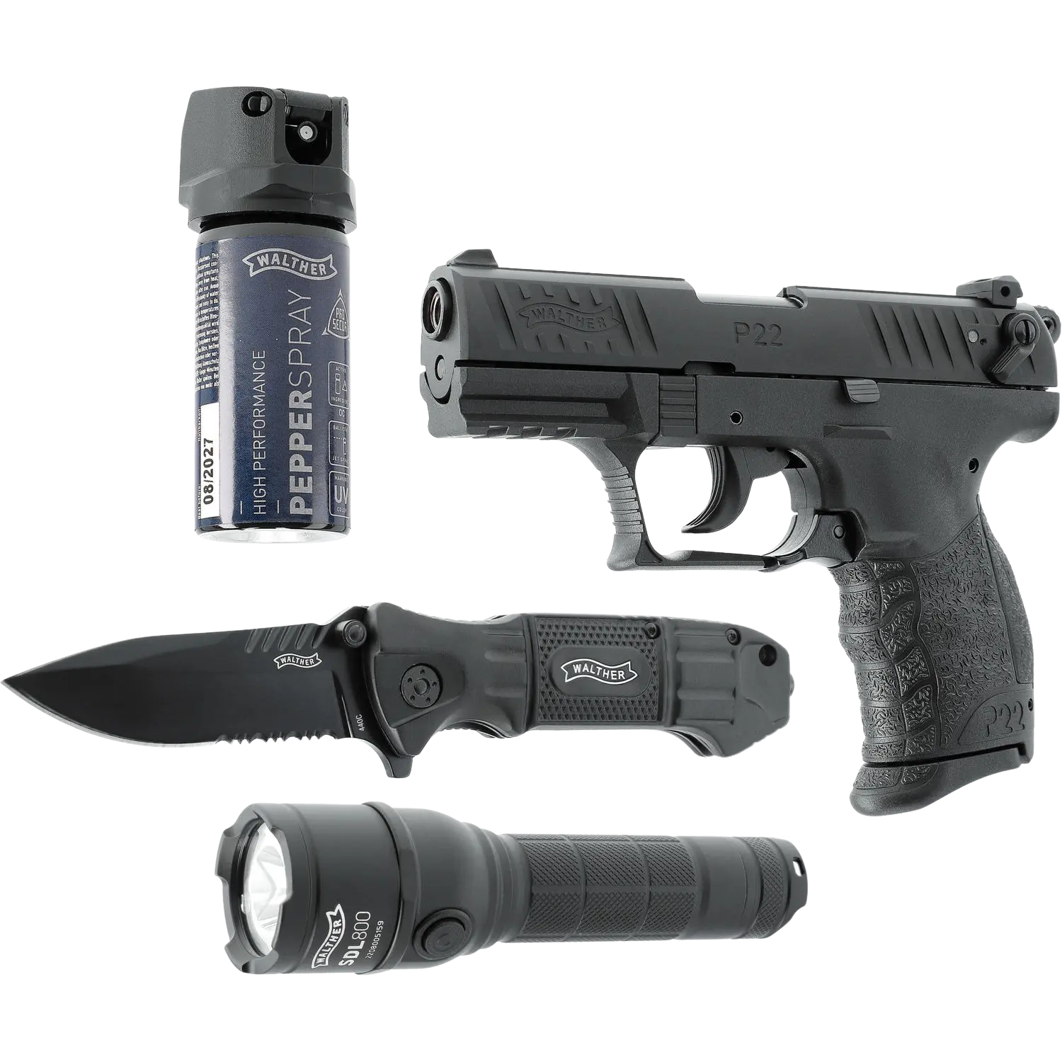 Unser Defense Walther Schreckschuss Set "S" bietet ausreichend Zubehör, um sich ein kleines überschaubares Verteidigungssortiment zusammen zu stellen. Das Walther P22 READY Waffenset inkl. 50 Schuss Platzpatronen, 25 Schuss Stop Blitz, 10 Schuss extra starker Pfefferpatronen und einem Pflegeöl. Die Walther P22 READY stellt alle Weichen, für ein optimales Verteidigungsgerät. Äußerst zuverlässig und viele Jahrzehnte erfolgreich am Markt etabliert. Das sind nur zwei der besonderen Merkmale, die die Walther P22 READY so beliebt in der Defense-Szene macht. Der Nachkomme der weltberühmten Walther P99 zeichnet sich dabei u.a. durch eine hervorragende Zuverlässigkeit, einer TOP Qualität, einem einfachem Handling sowie einer täuschend echt aussehnden scharfen Walther P22 aus und überzeugt mit erstklassigen Bedienerfreundlichkeit, sowie einem außenliegenden Hahn und beidseitig bedienbarer Sicherung. Die selbstladende Schreckschusswaffe besteht dabei zum größten Teil aus Polymer und ist sowohl für Links-, als auch für Rechtshänder optimal bedienbar. Das profilierte Griffstück und die extra griffige Durchladeriffelung im vorderen und hinteren Bereich des Schlittens garantieren einen festen Griff sowie einen stabilen Anschlag.Alle Fakten der Walther P22 READY Gaspistole im ÜberblickTyp: PistoleHersteller: UmarexModell: Walther P 22 READYFarbe: brüniertKaliber: 9 mm P.A.Knall / GasSchusskapazität: 7 SchussGewicht: 440 gLauflänge: 87 mmGesamtlänge: 154 mmAbzugsart: Double-Action-SystemSicherung: SchlagbolzensicherungBesonderheiten: Abzugschloss (Kindersicherung)Im Lieferumfang enthalten1x Walther P22 READY Schreckschusspistole inkl. Magazin1x Abschussbecher1x Reinigungsbürste1x Beschreibung1x stabiler Waffenkoffer50 Schuss Platzpatronen 9mm PAK25 Schuss Walther Blitzstop Munition10 Schuss Extrastarke Walther Pfefferpatronen1x Gunex Pflegeöl 50 mlVersand-HinweisDas Set beinhaltet Reizgaspatronen und dürfen derzeit nicht (Gefahrstoffklasse 1.4G) ausgeliefert werden. Beachten Sie bitte die zusätzlichen Informationen im Warenkorb.